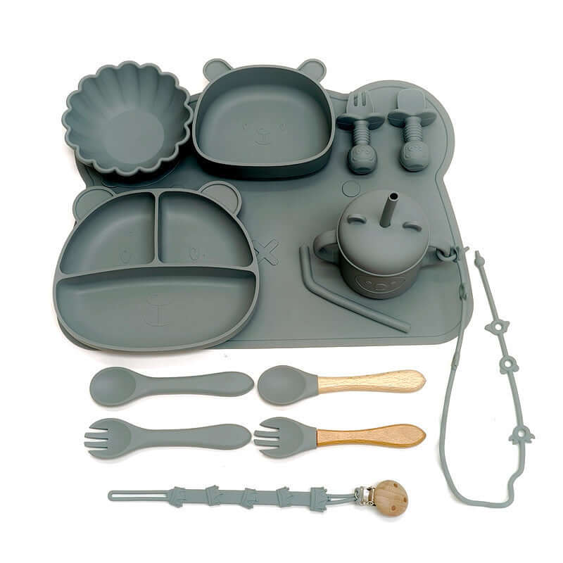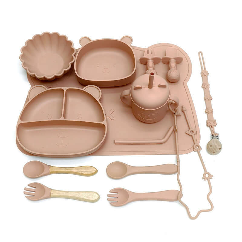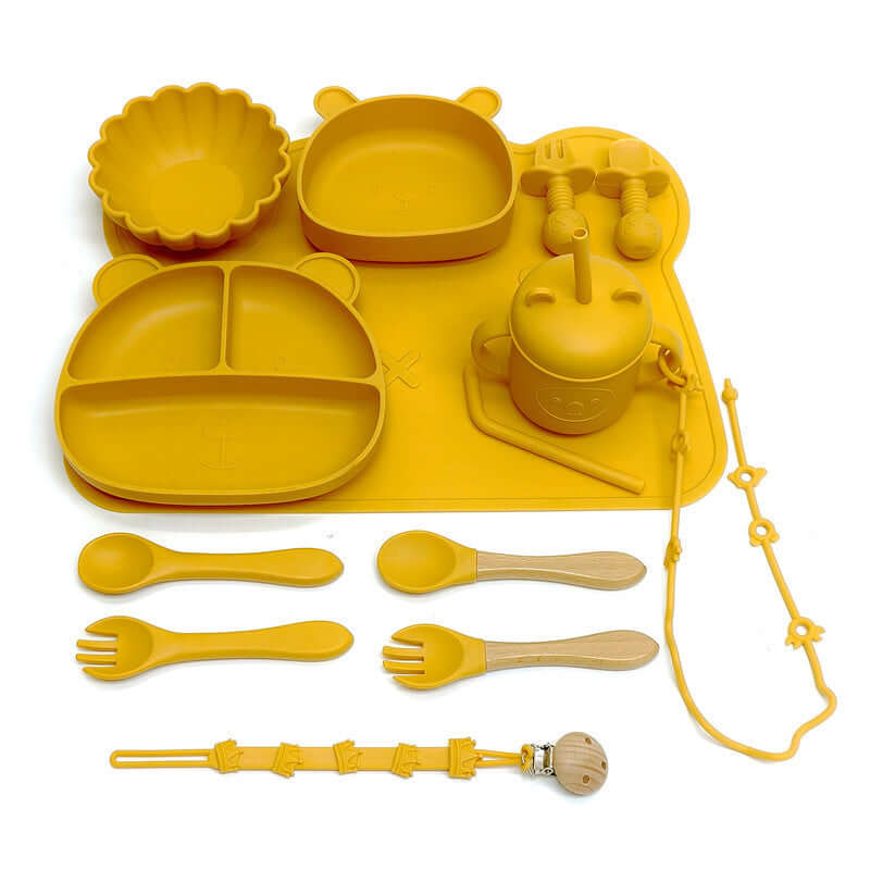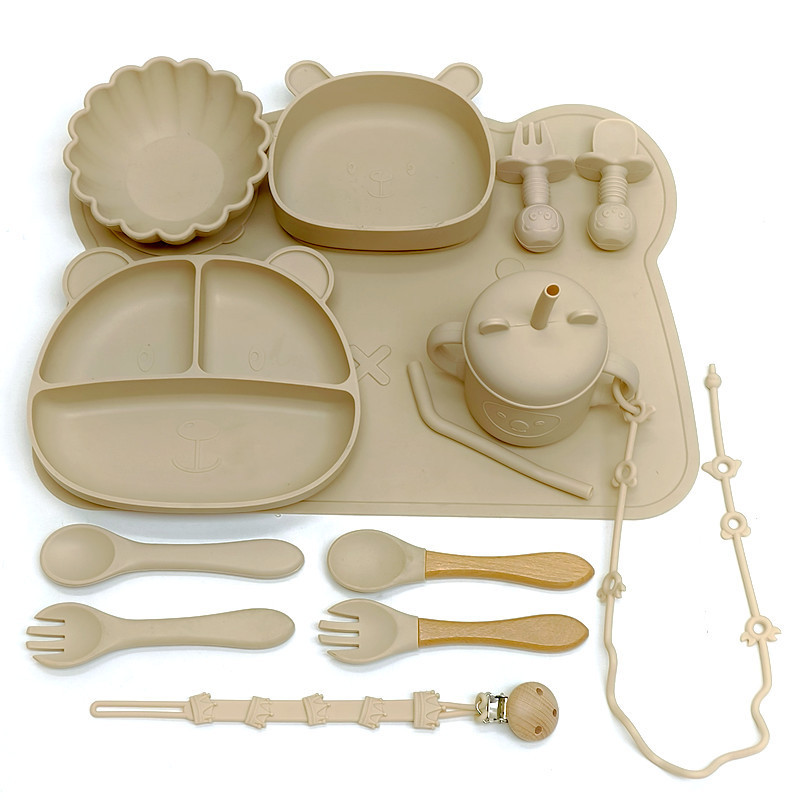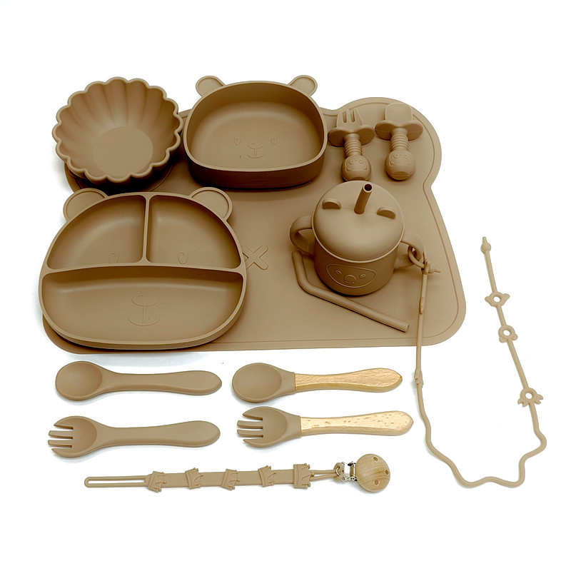 Bear 3-grid plate + bear bowl + pumpkin bowl + bear mat + silicone cup + short silicone spoon and fork + long silicone spoon and fork + wooden handle spoon and fork + animal anti-lost rope